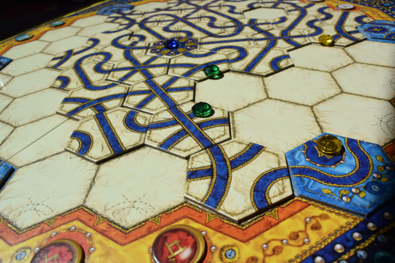 Цель игры: загнать в свои ворота драгоценные камни ( в зависимости от цвета имеют разную ценность. Желтый янтарь - 1 очко, зеленый изумруд - 2, синий сапфир - 3). А для того, чтобы собрать камушки (настоящие пластиковые сокровища::))), нужно по очереди из тайлов собрать витееватыый узор-лабиринт. Оооочень нравится всем играть. Производитель предлагает для каждого игрока ширму-ворота, но мы ими вообще не пользуемся. Смысл прятать сокровища, когда их и так немного. Понравилось, что игра учит договариваться. Можно ворота делить с соперниками и тут либо жадность выиграет, либо искусство ведения переговоров:)).