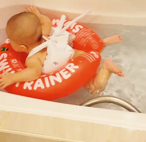 Вчера Алиночка впервые купалась в круге во взрослой ванне! Ей очень понравилось! Да и мне тоже. Во-первых, большое количество воды хорошо спасает от жары - доченька от нее очень страдает, ибо она у нас пухленькая, складочек много. Во-вторых, Алиночка хорошо успокаивается во время водных процедур. Ну и, в-третьих, дочке очень нравятся эти заплывы! Она смеется, стучит ручками и ножками по воде - сердце радуется, глядя на нее!