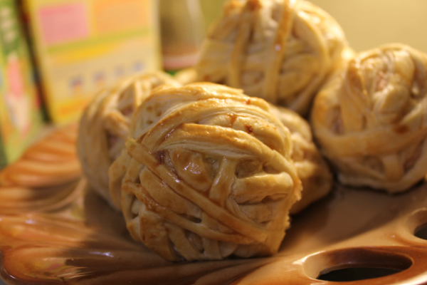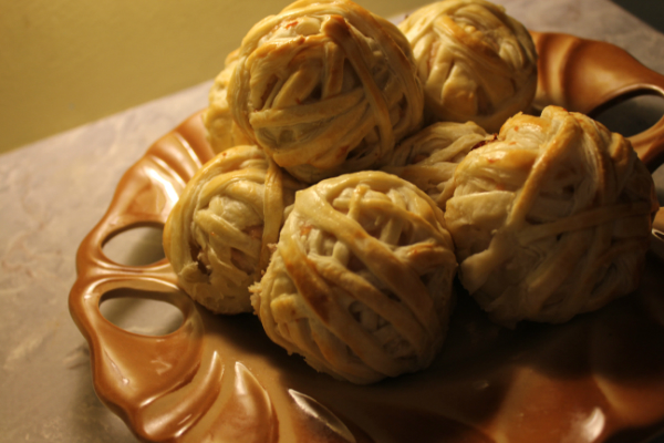 Делаем фарш из филе индейки(подойдет и любое другое-курица,крольчатина,свинина,что любите)и лука,добавляем соль,перец,перемешиваем.Тесто-слоеное бездрожжевое раскатываем,нарезаем тонкими полосками.Делаем из фарша тефтельки и наматываем на них полосочки теста как нитки на катушку.Сверху смазываем яичным желтком.И в разогретую до 180 духовку на полчаса(до зарумянивания)!