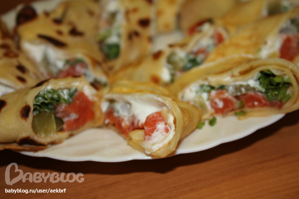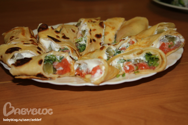 Блины(все знают,как пекутся)),семга соленая,зелень,маринованные огурчики и сметана.