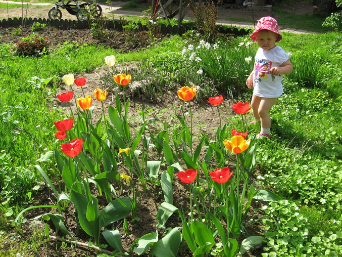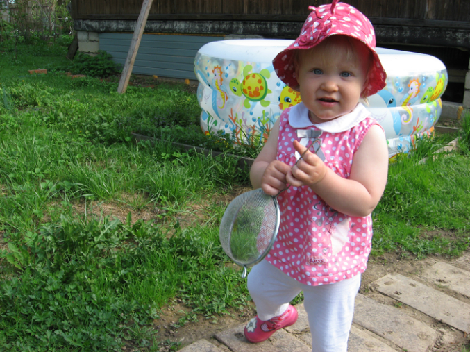Что интересует на улице? Птички, насекомые, цветочки. Песочница увлекает минуты на 3, бассейн вызывает жуткую истерику, даже сложно представить, что в том году плескалась в нем подолгу. Ну и конечно, любит, чтобы ее в коляске повозили по просторам садоводства, особенно когда устанет.
