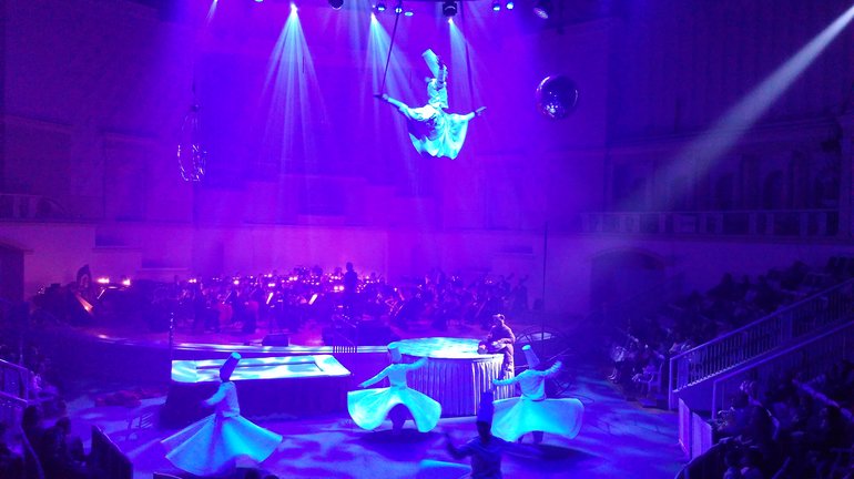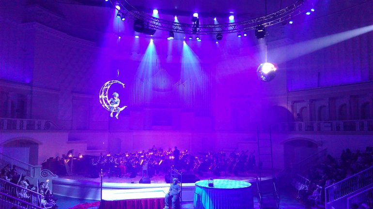 То по залу летал настоящий самолёт. Ёжик развлекал зрителей, паря на подвесной луне и вытворяя на ней трюки.