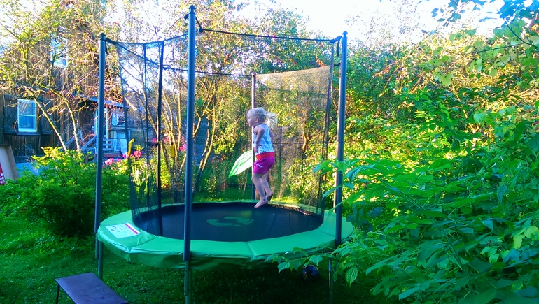 В детстве меня каждое лето отправляли в детский лагерь, развлечений там была масса, но одно из самых любимых мероприятий был батут. Как сейчас помню, как мы выглядывали в распорядке дня заветную запись о том, что сегодня наш отряд идет прыгать. И вот мы идем всей толпой, перекрикивая друг дружку устанавливаем очередность, ожидаем своих 5-10 минут, чтобы напрыгаться до бешеного ритма сердца. А еще помню это потрясное ощущение, когда сердечко начинает биться где-то в горле на пике прыжка. В такие моменты все мечты только о том, чтобы у тебя появился свой личный батут, чтобы можно было на нем прыгать с утра до ночи, ни с кем не делиться. И вчера моя мечта сбылась, потому что мы приобрели настоящий батут себе на участок, поменьше, конечно, чем в лагере, но это не помешало впасть в детство и порезвиться. Дочке все равно пришлось уступать))