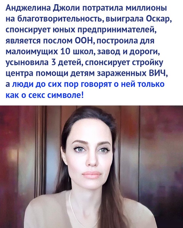 Очень она мне нравится. И красотка, и многодетная мама, и благотворительностью занимается, но при этом не кричит об этом на каждом углу, как наши "звёзды".