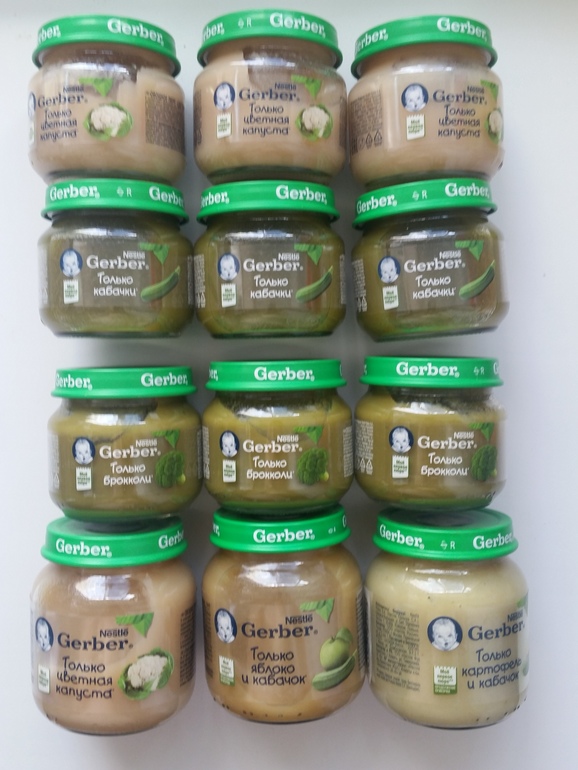 Всем привет!Хочу Вам рассказать о нашем первом прикорме!Побывав у педиатра,врач разрешила нам вводить однокомпонентные овощные пюре Gerber и безмолочные каши Nestlé.