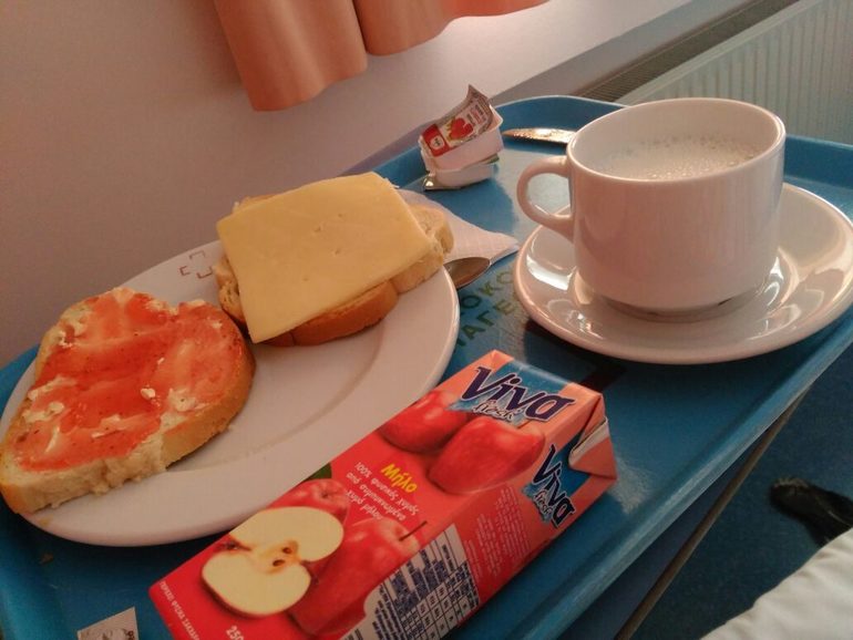 молоко теплое или чай (на выбор), хлеб с маслом и сыром, хлеб с маслом и клубничным джемом (или медом), яблочный сок