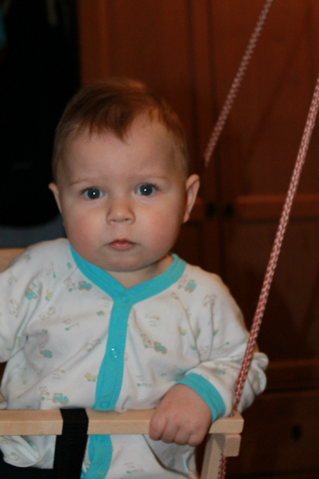 Не садите сразу ребёнка в качели дайте ему их сперва потрогать,поиграть с ними.Посадите туда его любимые игрущки и покачайте,чтоб малыш понял что это не страшно.Наш тоже так же привыкал.