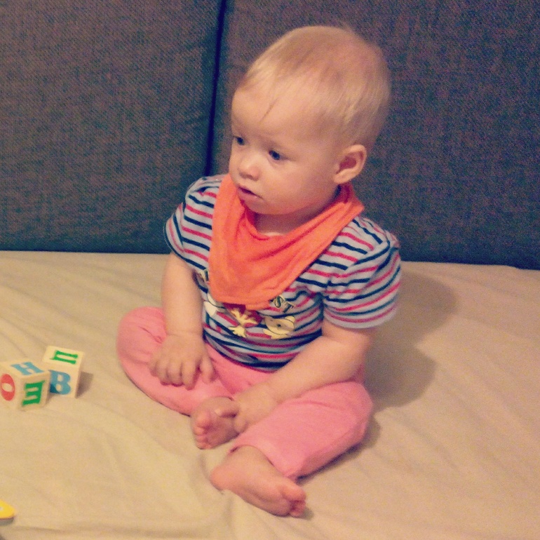 Это просто сумасшедший скачок в росте. На две недели мы ездили в гости к моей маме. А через две недели Анютка вернулась другим ребёнком. Научилась хорошо вставать и стоять, делает попытки ходить вдоль опоры, может играть с игрушкой стоя, только опираясь грудью на диван, усовершенствовала навыки ползанья, научилась махать ручкой в ответ. Улыбчивая.