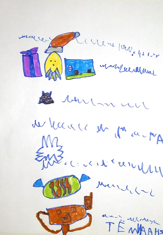 Письмо Деду Морозу. Уже якобы письменными буквами. Тёма просит для папы - удочку, маме-цветы, себе-планшет и робота, а Анютке - шапку с котиком.