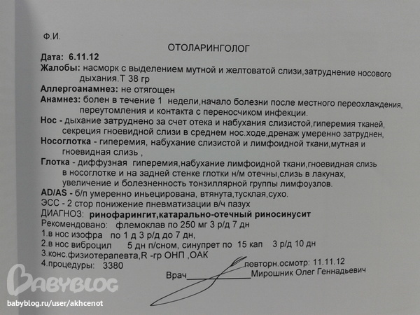 Заключение: острый ринофарингит, катарально-отечный риносинусит.