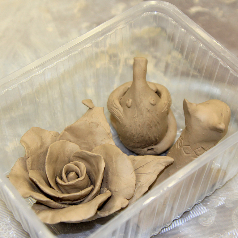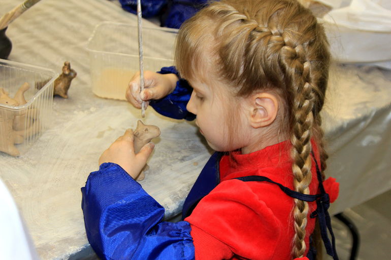 Из глины лепили свистульки. Работа довольно трудная, поэтому за столом в основном видела пап и мам. Саня лепила сама, но ей о-очень помогла инструктор. Свистулька высохла, и, представляете - она свистит! Сашке понравилось делать оттиски на глине разными колесиками и рисовать мордочку кошки палочкой.