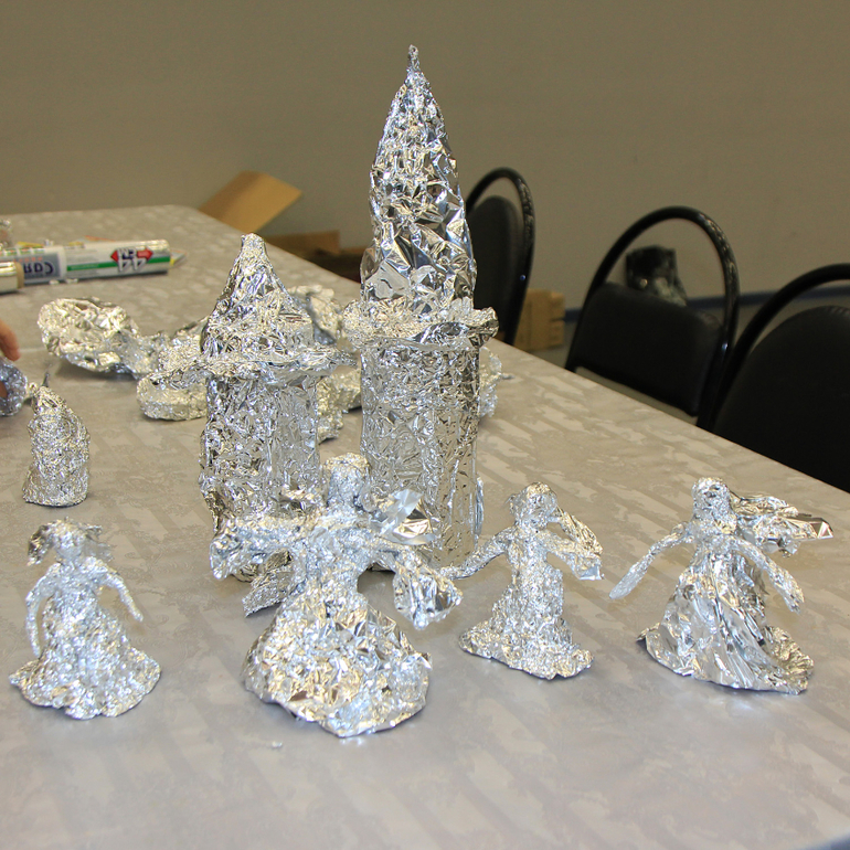 Ангелы и замки из фольги привлекали на Лепилке всех людей с фотоаппаратами. ну а дети за этим столом по очереди обзаводились блестящими коронами, мечами, щитами ))) дочка моя попробовала сделать рыбку и птичку из фольги, а многие уходили с блестящими паучками.