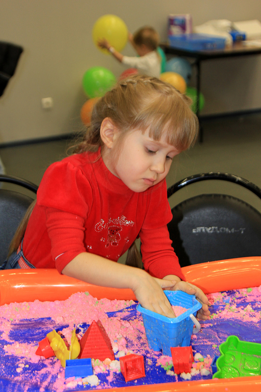 Было четыре песочницы - с кинетическим песком, с живым(белый), с игровым (розовый на фото, было много расцветок), и со смесью Bubber (фиолетово-бирюзовое нечто на фото). На все четыре песочницы ушло больше часа, никак дочка от них не могла отойти (а ведь дома стоит песочница с кинетическим песком!)