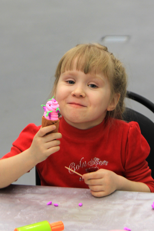 За столом от "Оранжевого слона" из мягкой застывающей массы для лепки и шарикового пластилина лепились новые шедевры )) Можно было сделать картину, размазывая пластилин по бумаге или слепить что-то объемное. У дочки получился рожок с мороженым и картина с рыбкой. Инструктор Людмила очень терпеливо и доброжелательно общалась с каждым ребенком и родителем, дочка провела за этим столом много времени ))