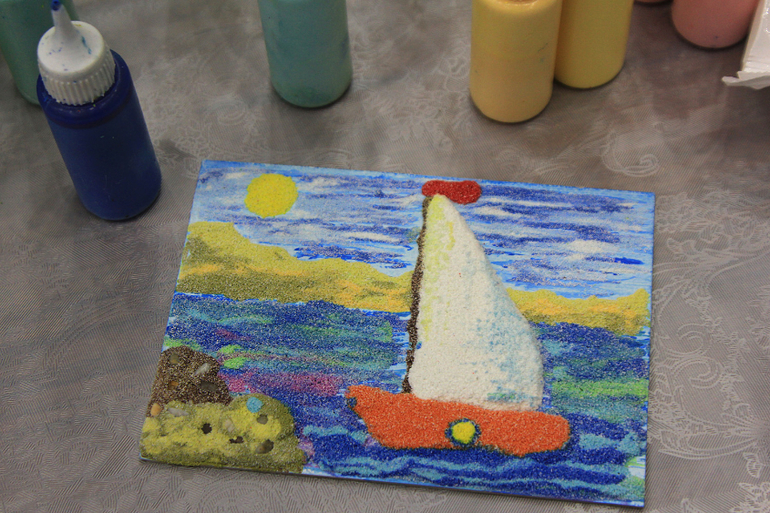 Мы начали с кварцевой живописи, очень уж впечатлил этот мастер-класс в прошлый раз. Пользуясь тем, что пришли в первых рядах и за столом еще никого не было, я тоже порисовала ))) отвела душу, в прошлый раз не получилось попробовать. более того, мы еще раз вернулись сюда и дважды порисовали песком за этот день ))) ну очень интересный процесс!