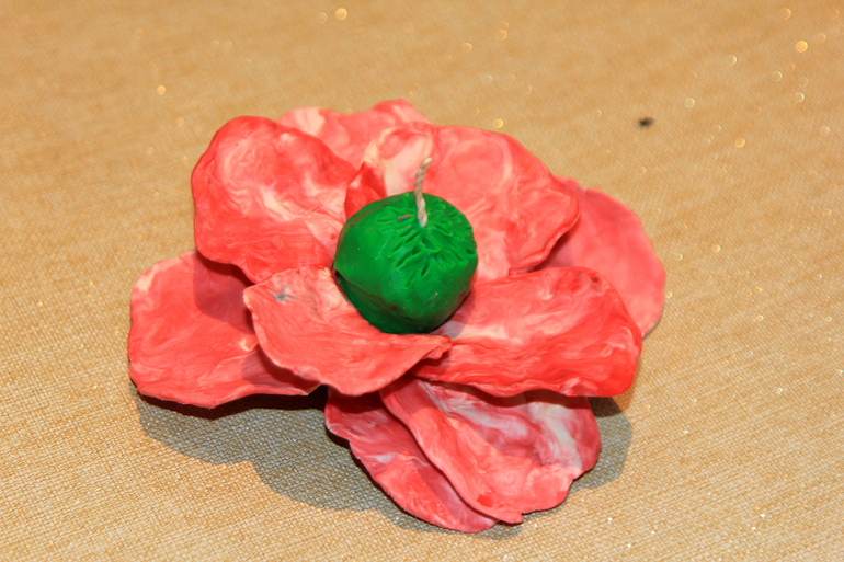 Из воска лепили свечи-цветы. Вырезать формами из пластины воска ребенку трудно, а разминать воск и лепить, как из пластилина - отлично получается.