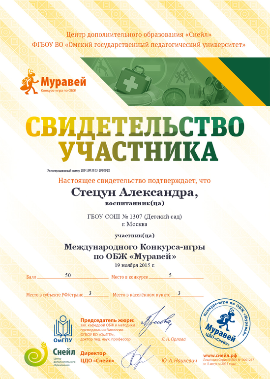 Не поверишь - на ББ инфу нашла )) Спасибо Ирине и ее посту, почитай, там ссылка в тексте есть. Просто эта олимпиада была ближайшей, мы и зарегистрировались. Вопросы были о безопасности вообще - про ПДД, про то, что нужно делать при солнечном ударе, что нельзя уходить с незнакомыми, которые котенка обещают и тд. то есть, в принципе, обо всем этом когда-то говорилось и обсуждалось. я и рассматривала эту олимпиаду скорее как повод лишний раз с Санькой поговорить еще раз о безопасности. не ожидала диплома, чесслово. отправила те ответы, которые Сашка дала, решила быть честной, не помогала )) если б хотела первое место - оно бы у нас было )))) из 5500 детсадовцев дочка в первых пяти сотнях, уже достижение. А вот то, что в списке призеров первые шесть человек с макимумом баллов, все - из одного детсада и от одного воспитателя, уже наводит на мысль о серьезной взрослой помощи.