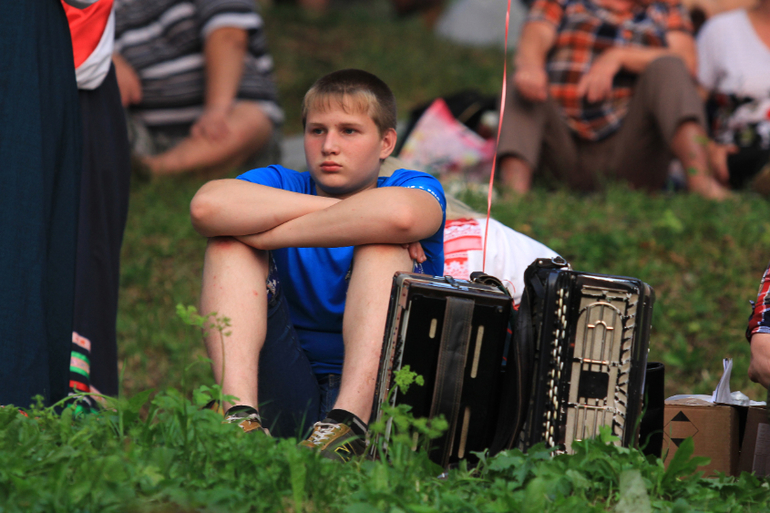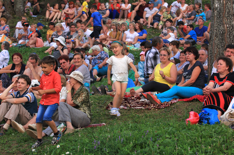 На склоне холма у озера сидят люди, смотрят концерт, жарят шашлыки, общаются, пьют всякое-разное и закусывают под русское народное))) С собой приносят покрывала, разную еду, даже самовары. Общее праздничное настроение быстро передается вновь пришедшим, хочется улыбаться и подпевать артистам. Конечно, еще была праздничная ярмарка, батуты-карусели и катание на моторных лодках, а кто-то даже купался в озере, не обращая внимания на толпу)).