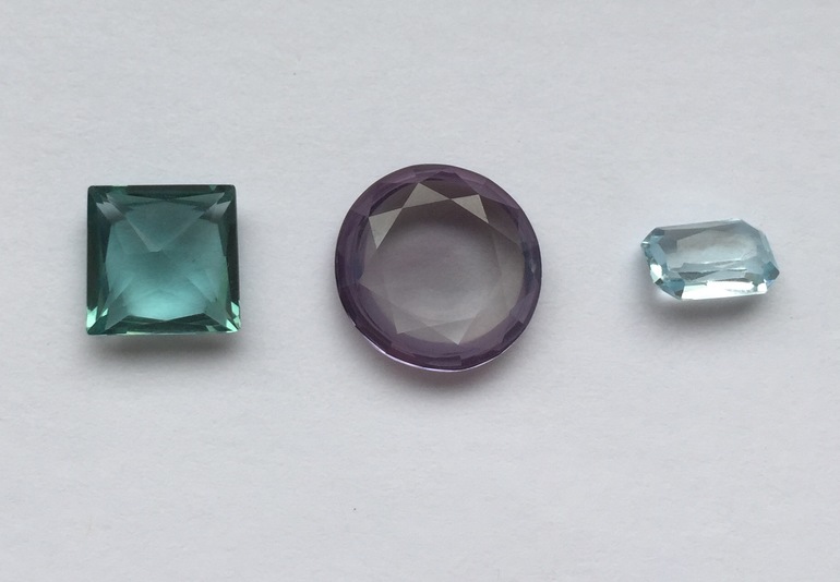 Первый квадратный - прозрачно-голубой. Круглый в центре - я вижу его скорее голубым или бензиново-голубым, а фотокамера - фиолетовым. Третий маленький - бледно-бледно-голубой.