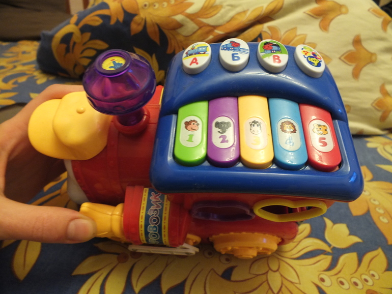Обучающая, развивающая игрушка "Паровозик". Супер-игруха!!! Неубиваемый!Качественный пластик. Во время езды двигаются глазки. Свет, звук, сортер с фигурами разных цветов, внутри фигур - фрукты соответствующие цветом фигурке. Учим буквы, цифры, цвета, животных. Функция "Проверка знаний" (Покажи где....). Вобщем очень занимательная вещь. У нас был просто хитом! Состояние отличное. Экв. 950. Ценю.