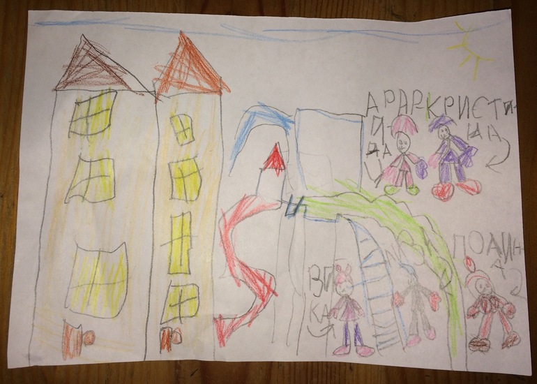 Признаться честно, рисунок собственной дочери я не узнала - рисовать человечков не самое викино занятие)))...Но в саду больше никто не смог бы подписать их!