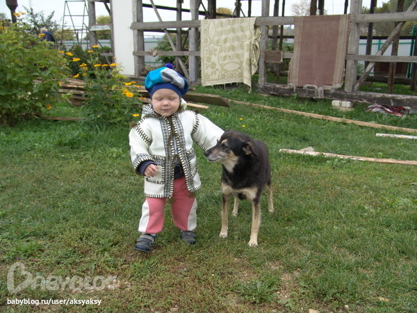 Это вот мы фоткали в деревне, когда из Туниса вернулись. Привезли ребеночку вот эту беленькую хламидку с капюшончиком, он в ней ходил, как деревенский щеголь))) На поверку она оказалась искусственной, материал - что-то вроде стекловаты((