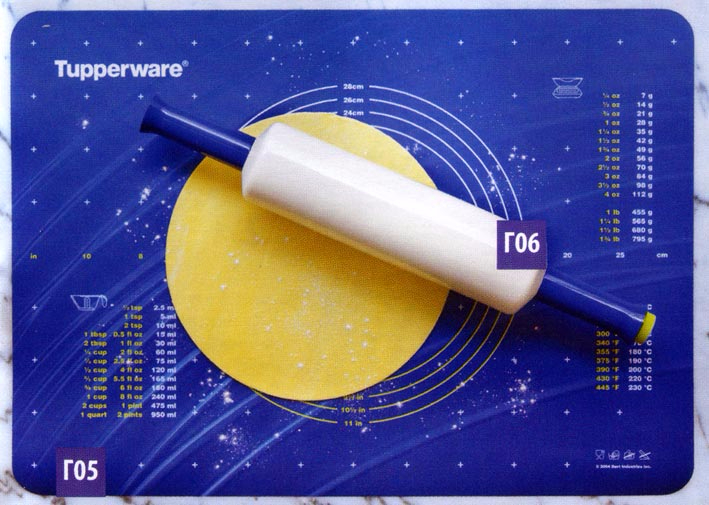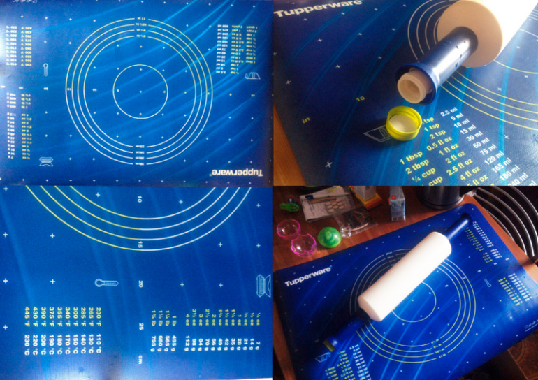 Шикарный коврик в комплекте - с кучей полезных пиктограмм и обозначений - раскатывать тесто одно удовольствие, кто имел дело с продукцией Tupperware - то поймет.