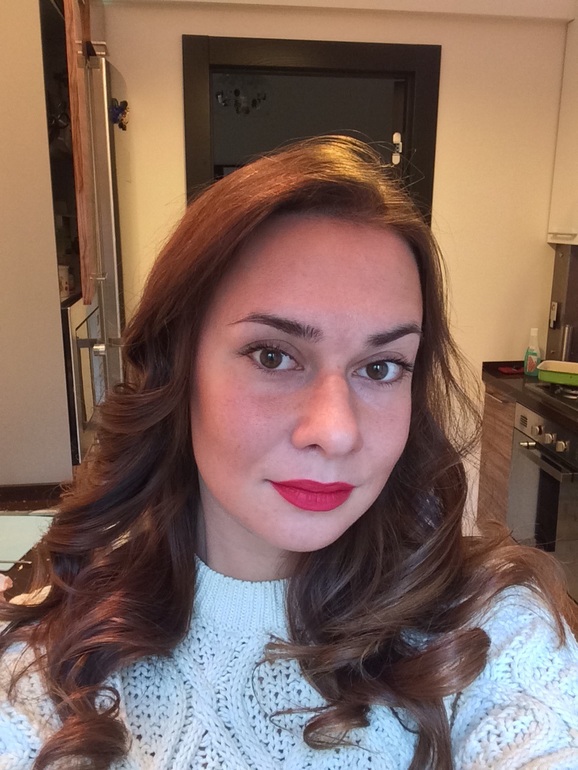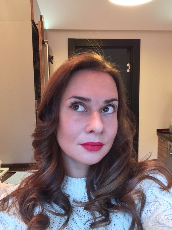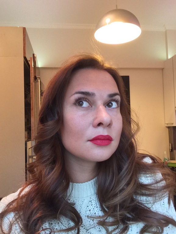 Помада абсолютно матовая с первых мгновений нанесения. Цвет яркий, красный, но с холодным бордовым подтоном. Для меня актуально, так как тип внешности холодный, помады с оранжевым или коралловым подтоном мне не подходят. На фото самой помады я не смогла поймать этот оттенок даже на дневном свете. Но на фото лица это уже заметно.