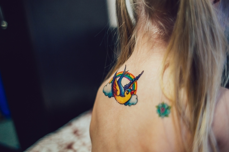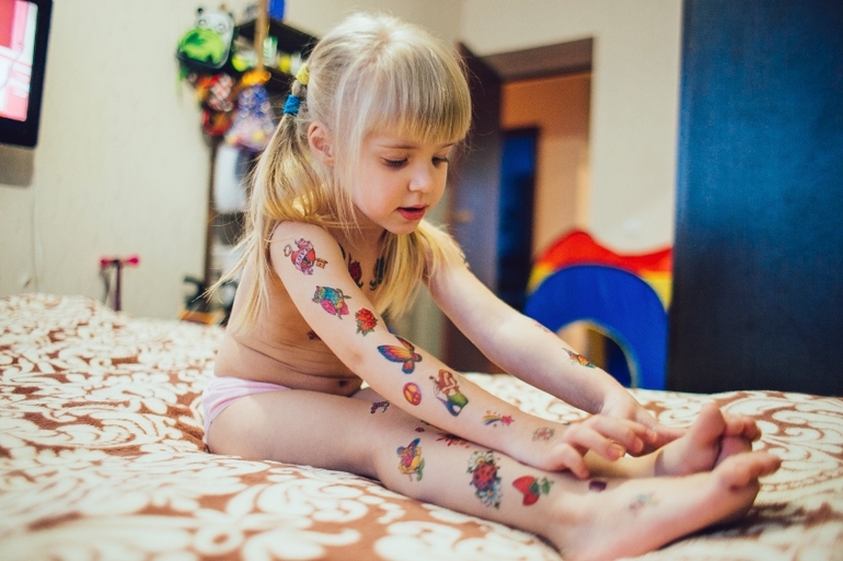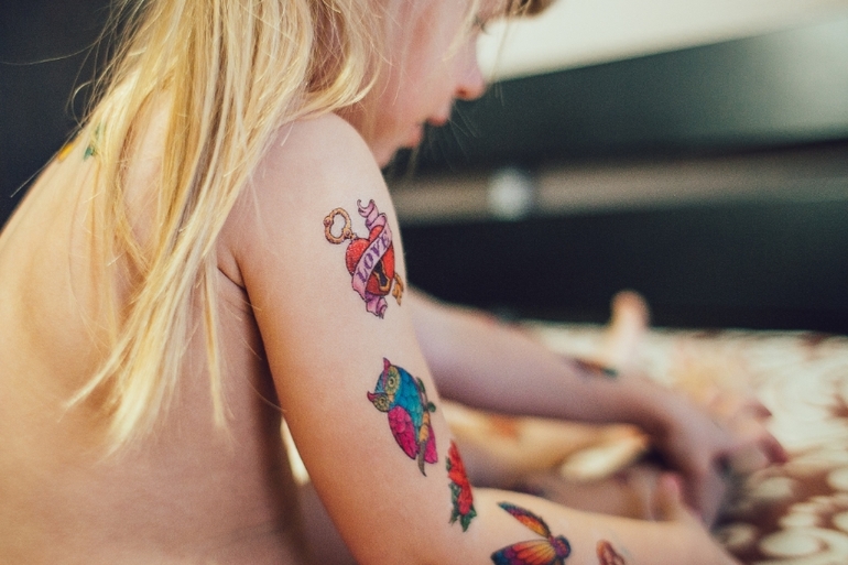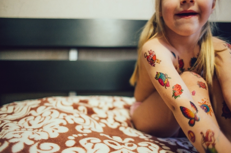 Вот пролетел месяц бабушко-дедушкиного отдыха у нас. Событий было огромное количество, такое ощущение как будто дня три прошло не больше, после отъезда родителей я прям осиротела немного. Ну ничего, работы много, скучать некогда. Арина за этот месяц сильно подросла, такая умница, "ррррррр" говорит, учится соединять с гласными, пока только "ррррааа" осилили. Стала бояться темноты, остаться одна, и просит чтобы мы с папой не ругались, потому что мама плачет... звоночек нам, да что звоночек, звон! Принимаем меры :) Сейчас она так подросла, что хочется с ней на природу поехать, с палаткой, на денек, а может даже с ночевкой :) Надо осуществить, пока за вторым не пошли :))) Кстати, Арина уже хочет быть старшей, и ей нужна сестренка говорит. :) да и я не против :) быстрее бы добраться до фотографий из этого мини-отпуска... Эх. В марте, в Ашане, я наткнулась на татуировки-переводилки в стиле олд скул, и не смогла устоять! Налепили Аринке сразу пачку, обе были довольны :))))))