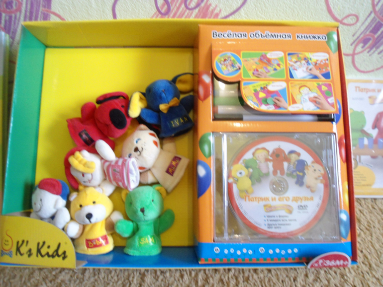 2)Набор DVD диски (3 шт.) с мультфильмами и Куклами на пальчики (7 шт), K'S KidsВеселый игровой набор. Надев на пальчики кукольных героев, можно устраивать домашние спектакли. На каждом диске 6 мультфильмов: «Цвета и формы», «Тени», «Тяжелое и легкое», «Фрукты цвета радуги», «Цифры», «Звуки», «Музыка», «Рисование», «Будь в форме», «Где твои вещи», «У каждого есть мечта», «Природа», «Друзья помогают друг другу», «Делимся с друзьями», «Спасибо и пожалуйста», «Мими заболела», «Смелость», «Извинения». Возраст: от 1,5 лет