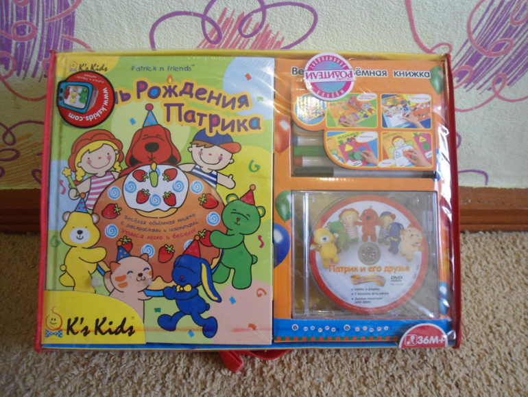 Красивый подарочный набор.нам подарили.но мы так его и не открыли.каждый диск и книжка в плёнке. в упаковке 2 разных набора одной серии прекрасно дополняют друг друга. всё в идеальном состоянии.описание из интернета. 1) Замечательный игровой набор «День Рождения Патрика». Увлекательная книга порадует малышей. Каждая страничка книги - это отдельное задание, которое охотно выполнит любой ребенок с помощью дополнительных предметов набора. Цветные фломастеры позволяют рисовать в книге, а стирать рисунки можно специальной губкой (входит в комплект). Чтобы познакомиться с формами и цветами воспользуйтесь магнитами, которые легко крепятся к страничкам книжки. А развивающие мультфильмы с любимыми героями помогут закрепить полученные ребенком знания. На диске 3 мультфильма: «Цвета и формы», «У каждого есть мечта», «Друзья помогают друг другу». Возраст: от 1,5 лет.