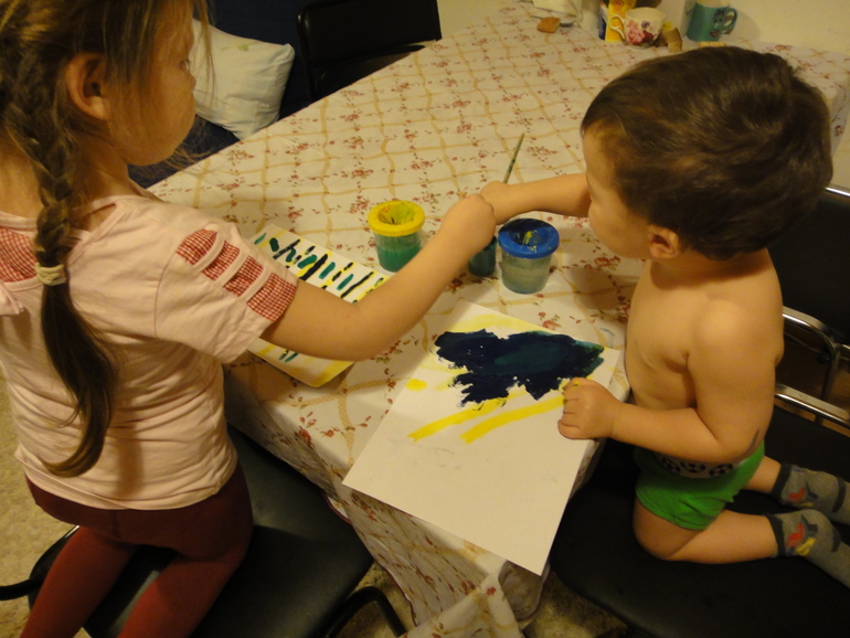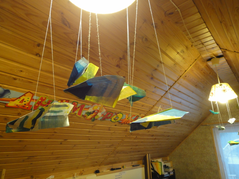 Мы решили украсить комнату самолетиками, для этого взяли 5 листов формата А4, раскрасили их, высушили, разрезали пополам и ву-аля - получилось 10 самолетиков