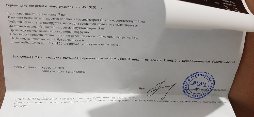 Но сейчас не об этом) Решили мы с мужем родить девочку. Цикл сбился, до 40 дней. В общем неделю назад поняла, что беременна, по признакам, запахи, грудь и т.д... Сегодня пошла на узи и результаты не радуют... По М срок 7 нед. По УЗИ 4 - что соответствует сроку зачатия. Ставит не развивается под ??? Врач УЗИ по моему с маленьким опытом... Ни размеров матки ни фига. Вот сижу теперь и накручиваю себя. ХГЧ сдала в пн. Повторю.