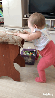 Наклоняется, если видит что-то под диваном, стулом и т.п. но достать пока не получается 😃