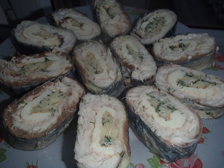 2. Уложить рыбу на пищевую пленку чуть-чуть внахлест голова к хвосту потом опять голова. Надеюсь, понятно написала.