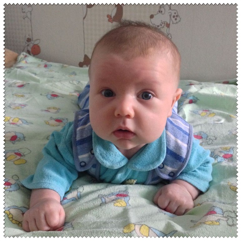 Чудо-мальчик, ночью спит по 5-7 часов, любит болтать и дарить всем свои улыбки. Начал поворачиваться с живота на спину, а вот наоборот еще не получается. С удовольствием исследует окружающий мир, начал все тянуть в рот, руки так просто локоть в слюнях)) Очень люблю нашего сыночка!