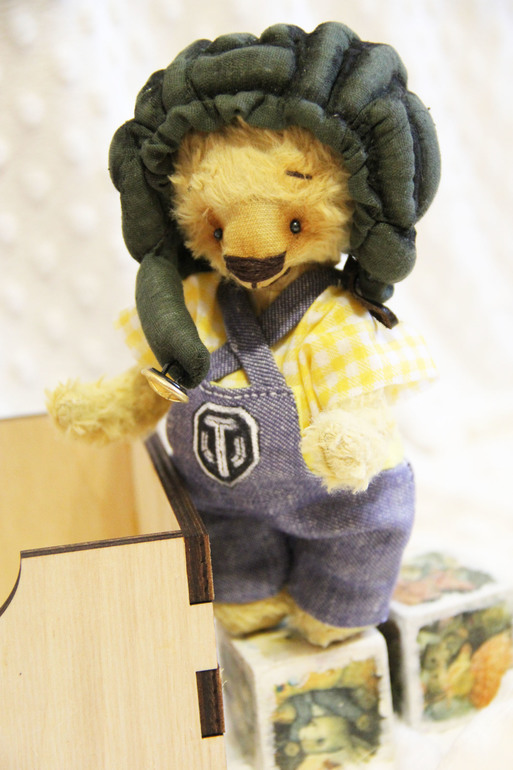 17 см ростом, вискоза, 5 шплинтов, опилочки, тонировка и шлем танкиста