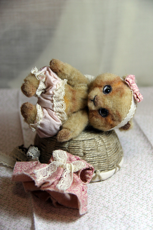 Одета в хлопковые панталончики, платье и повязку...получилась наивная крошечная девчушка, рост 9 см сидя..