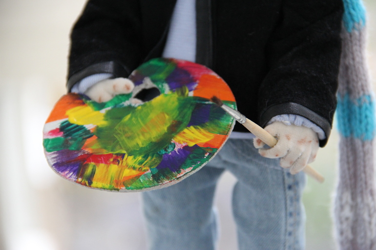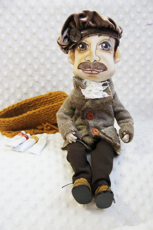 Сшит уже давно, никак не могла доделать аксессуары..Рост 44 см, сшит из тонированной бязи, расписан акриловыми и масляными красками, руки-ноги-пальцы на проволочном каркасе, можно сгибать, одет в брюки, рубашку с жабо, пальто из какой-то очень приятной на ощупь ткани, ботинки из натуральной кожи, берет и толсто вязанный шарф, в руках держит небольшой мольберт с эскизами..