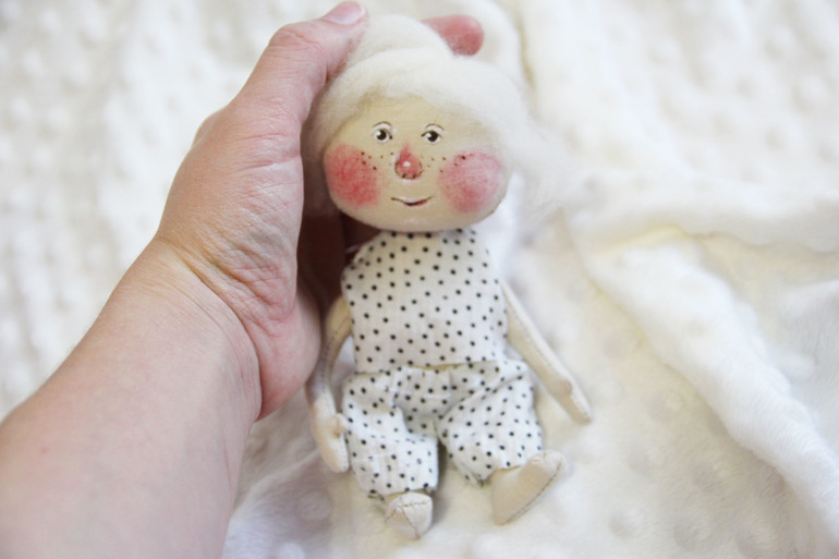 Малышка 15 см ростом, ручки-ножки двигаются, сшита из тонированной бязи, расписана акриловыми и масляными красками, волосики-шерсть для валяния