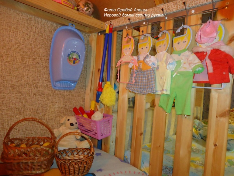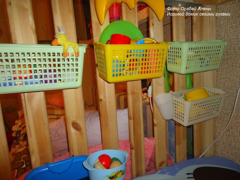 Материалы: брус 50х50мм; оргалит; бумажные обои с рисунком под кору дерева - для реалистичности «избушки». В качестве боковых стен использовано ортопедическое основание от разобранной икеевской кровати, но вполне можно обойтись и глухими стенами - даже проще.