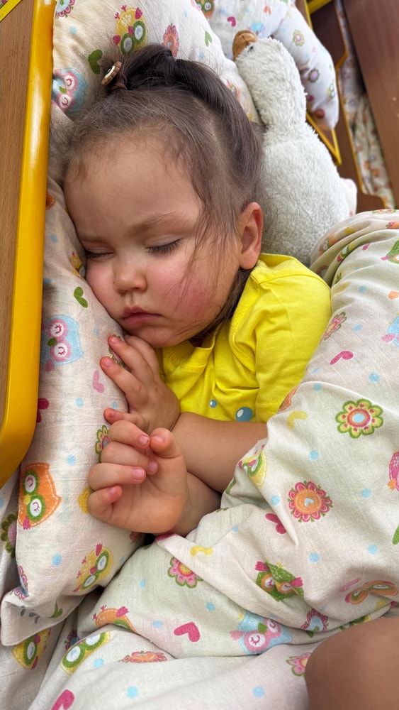 Сидим мы с мужем значит на низком старте,готовы бежать забирать,так как дома она засыпает ТОЛЬКО когда рядом с ней в её кровати лежу я или муж. И тут мне воспитатель присылает 📷 Первый сон в саду