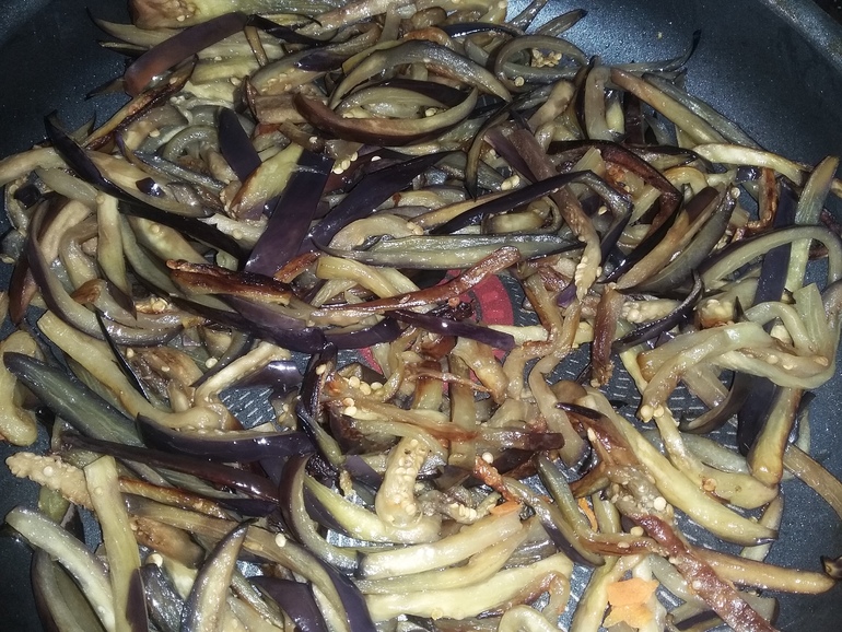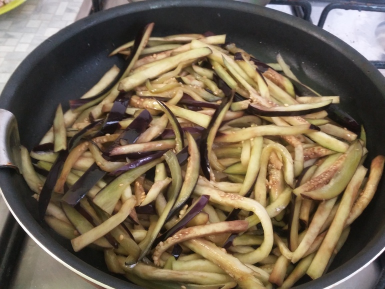 Обжарить баклажаны, помешивая, 5-7 минут, на среднем огне: