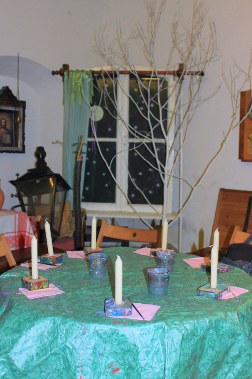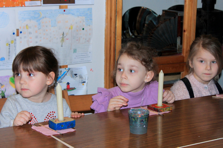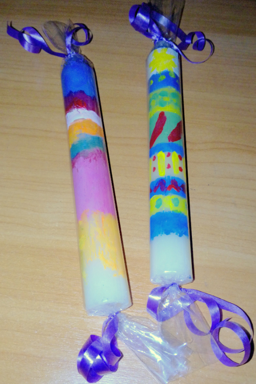 Сначала мастер-класс по росписи свечей. Обычные парафиновые свечи раскрашивали акриловыми красками. Атмосфера очень творческая. Разрисовывали свечи не только дети, но и родители)))