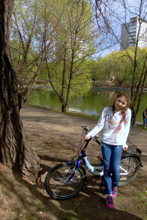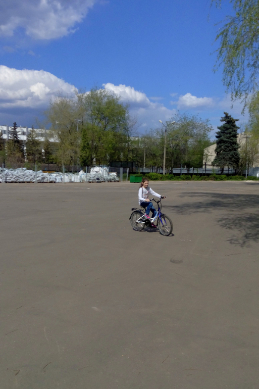 Где-то в конце апреля мы встретились с друзьями. Соня, Настина подруга, была на велике и Настёна решилась попробовать. И ПОЛУЧИЛОСЬ!