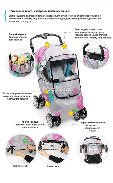 Окошко на молнии позволяет легко сажать ребенка или доставать его из коляски не снимая дождевика. Надежная система крепления удерживает дождевик даже при сильном ветре и позволяет идеально закрепить на любой коляске. Дождевик складывается в сумочку (в комплекте). Имеются кармашки для мелочи, защитная шторка от солнышка и любопытных глаз.