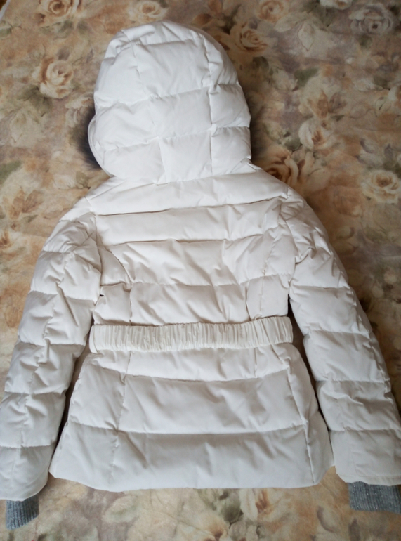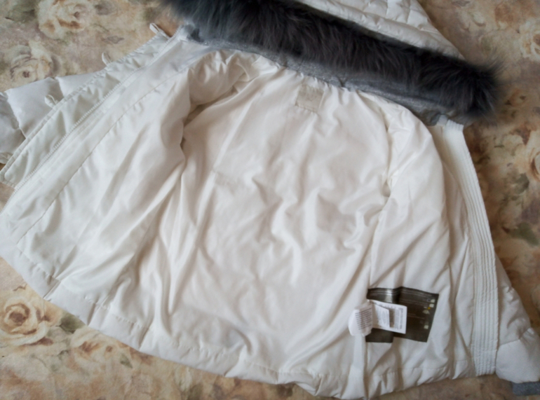 Цвет молочный, очень красивая,мех натуральный съемный, состояние очень хорошее, НО с незначительным нюансом- пришлось подшить в одном месте ПО ШВУ- совершенно не бросается в глаза