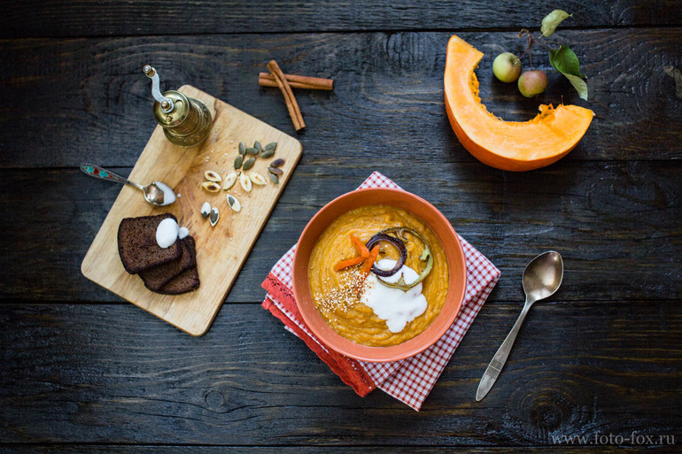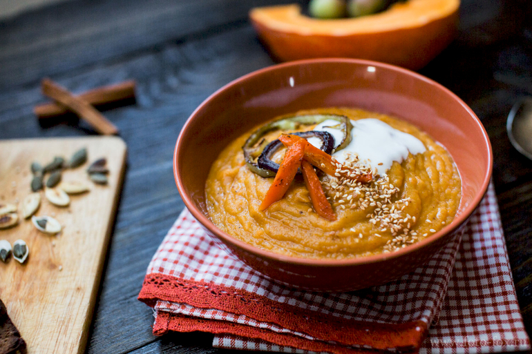 Сезон тыквы продолжается, каждый год мы делаем из нее суп! Запекаем с овощами в духовке и измельчаем блендером. Подробный рецепт есть на сайте , спасибо за это моему супругу! А какие у вас традиционные блюда осени?