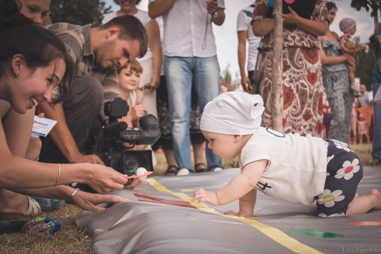 Уже 3-ий год подряд по инициативе мэра города у нас проводится "Забег ползунков". Участвуют малыши в 3 возрастных категориях: 6 мес-1 год- нужно проползти дистанцию в 5 м, 1-1,5 года- также проползти 5м из которых половина труба из ткани и 1,5-2 года- езда на машинках 5м. Участвуют больше 100 малышей (видела ребетенка с номером 108). Вот так!