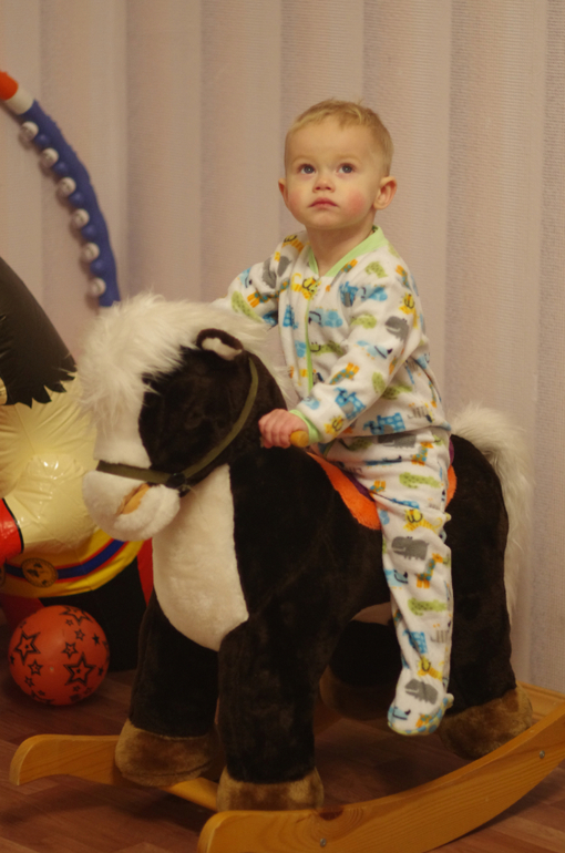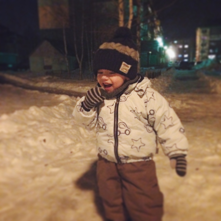 Тимка. Он парень веселый, ему все нипочем, носится по квартире как ураган, стал подниматься и спускаться по ступенькам без моей помощи, одергивает руку и все, я только страхую, а он туда сюда, вверх-вниз, и хотя в зимнем комбинезону совсем неудобно, он в себе очень уверен, несмотря на периодические падения)))